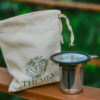 Un infusor de acero inoxidable con su bolsita de lienzo